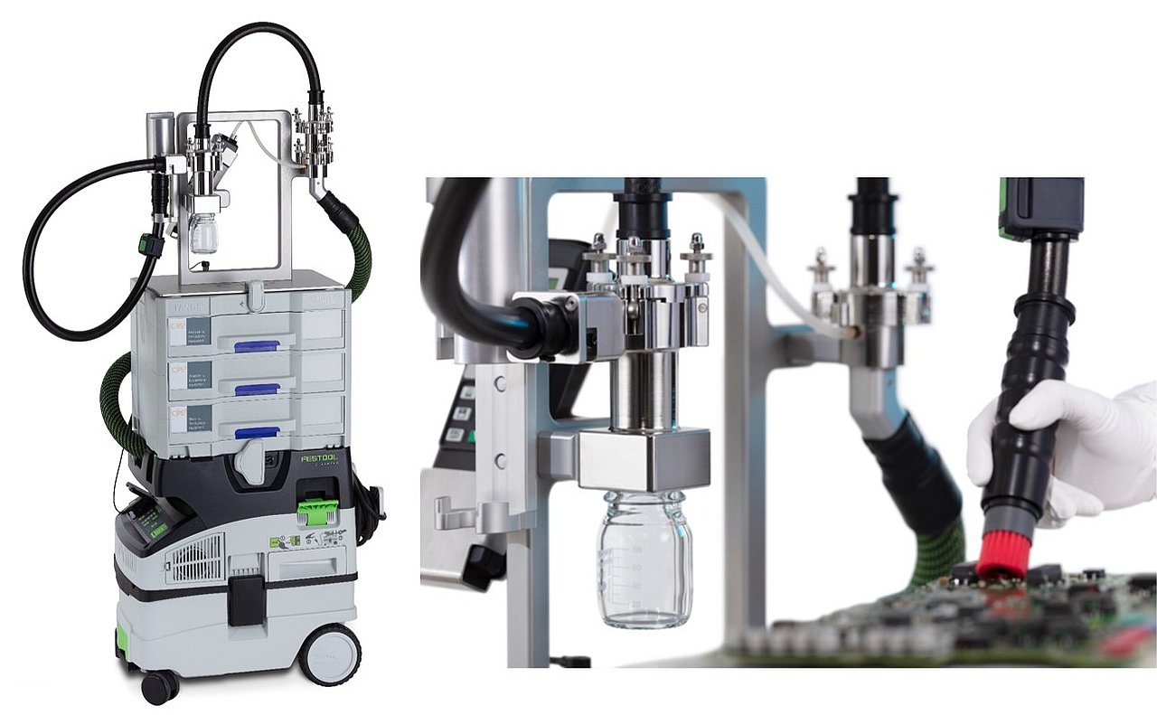 Um die Analyse der entsprechenden Prüfbereiche zerstörungsfrei direkt in der Montage ausführen zu können, konnte das Saugextraktionsverfahren gefunden und definiert werden. Dieses Verfahren erlaubt es eingegrenzte Bauteilbereiche trocken und zerstörungsfrei zu extrahieren, indem eine auf das Bauteil angepasste Düse entlang der relevanten Bauteiloberfläche geführt und die partikuläre Verunreinigung durch die geeignete Kombination von mechanischen und strömungstechnischen Reinigungsfaktoren gelöst wird. (siehe Abbildung 3) Im Montageablauf können in definierten Intervallen die teilweise montierten Batterien gestoppt und die entsprechenden Prüfbereiche mittels des C|PS²-Saugextraktionssystems extrahiert werden. (siehe Abbildung 2) Anschließend kann die Batterie wieder in den Serien-Montage-Prozess eingeschleust und weiterbearbeitet werden. Im Saugextraktionssystem wird die gelöste Kontamination gezielt auf einem Filter oder aber in einem Laborglas abgeschieden und kann nachfolgend mittels den aus der VDA19.1 bekannten Analysemethoden analysiert und ausgewertet werden.