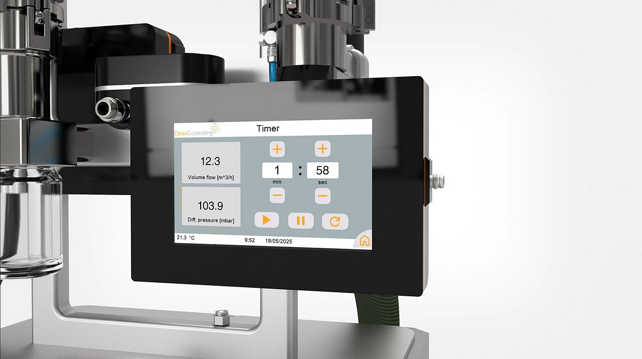 Um die neuen normativen Anforderungen und Parameter der VDA 19.1 sicher überwachen zu können, hat CleanControlling eine neue Messeinrichtung mit Touchdisplay und allen für die Saugextraktion relevanten Funktionen entwickelt. Über das Touchdisplay können der Volumenstrom und der Differenzdruck in Echtzeit kontinuierlich dargestellt werden. Darüber hinaus sind zusätzliche Funktionen wie Timer oder Stoppuhr sowie zur geführten Nassreinigung des Systems integriert.