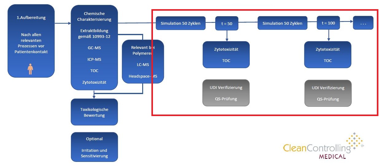 The life cycle test is carried out in several steps. First, repeated cleaning and sterilization cycles, as they occur in clinical practice, are simulated. Validated procedures such as machine cleaning in washer-disinfectors (WDs) and steam sterilization at 134 °C are used. Typically, up to 200 cycles are performed to determine the maximum service life. Between cycles, tests such as cytotoxicity tests and TOC analyses are performed to verify biological safety. In addition, functional tests and material analyses are performed to ensure the integrity of the product.