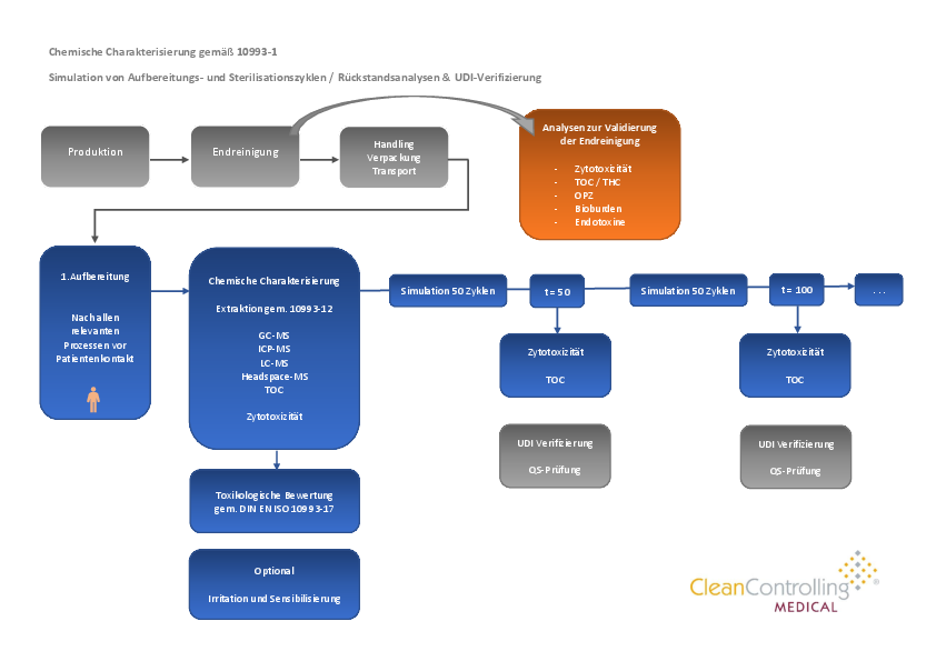 In Folge der Biokomatibilitäts-Bewertung mit der chemischen Charakterisierung und toxikologischen Bewertung wird das Medizinprodukt mit einer Simulation von mehreren Aufbereitungszyklen nach der validierten Herstelleranleitung unterzogen. Nach einer definierten Anzahl an Aufbereitungszyklen wird z.B. mittels Zytotoxizität und TOC die biologische Sicherheit des Produktes bewertet. Ausserdem spielen hier auch die UDI-Verifizierung sowie die funktionelle QS-Prüfung durch den Hersteller eine wesentliche Rolle. Durch mehrere Zyklen-Reihen wird die maximale Lebensdauer der Produkte ermittelt und festgelegt.